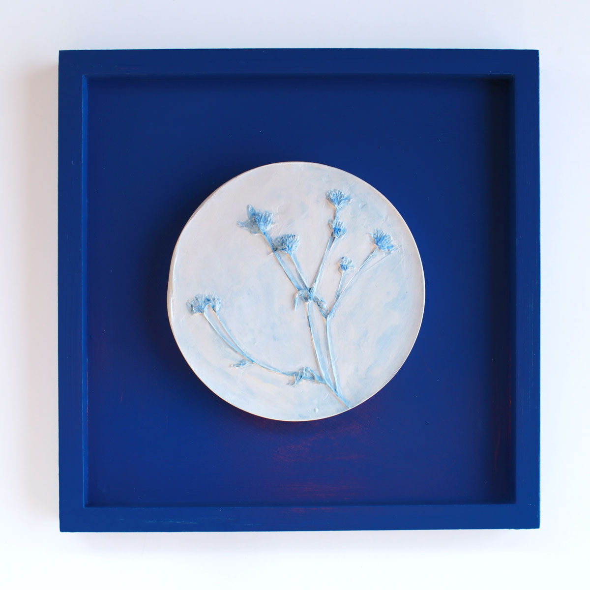Intricate details and textures of dried botanicals are captured in a one-of-a-kind, plaster relief hand-painted in a light blue with a vibrant cobalt blue frame.